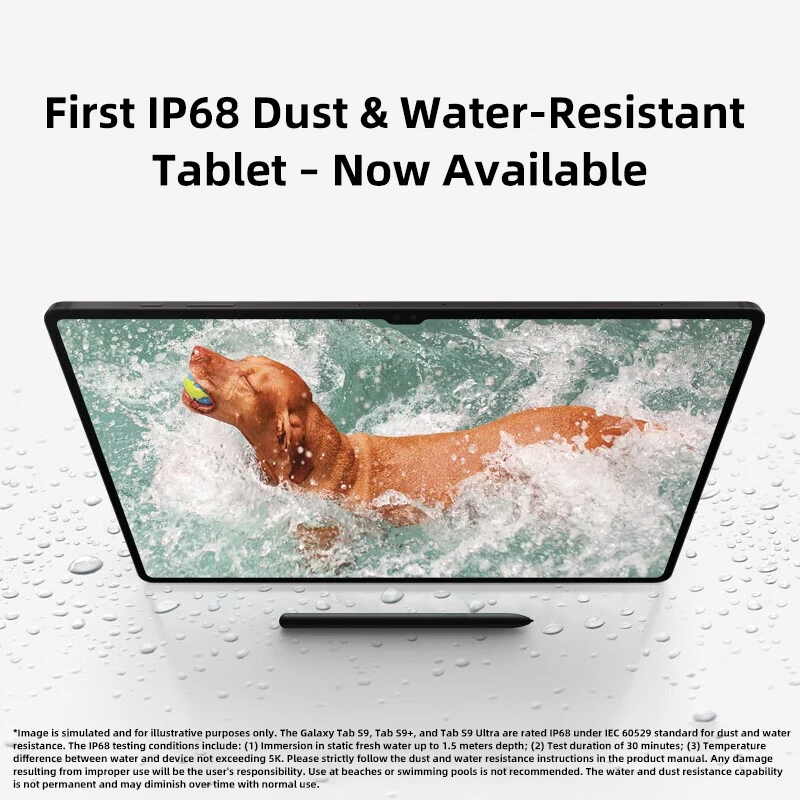 *The images are simulated for demonstration purposes only. Colors and models may vary due to different carriers or operators. The Galaxy Tab S9, S9+, Galaxy Tab S9 Ultra, and their supporting Galaxy Tab S9 series S Pen stylus have an IP68 protection rating. They meet the IP68 dust and water resistance grade defined in IEC 60529, where the test conditions for IP68 grade are: (1) still fresh water with a depth of 1.5 meters; (2) test duration of 30 minutes; (3) water temperature difference from the product not exceeding 5K. Please use it strictly in accordance with the dust and water resistance instructions in the product manual; otherwise, the user shall bear the responsibility for any equipment damage caused. It is not recommended to use it on the beach or in swimming pools. The device’s water and dust resistance is not permanent and may decrease over time.